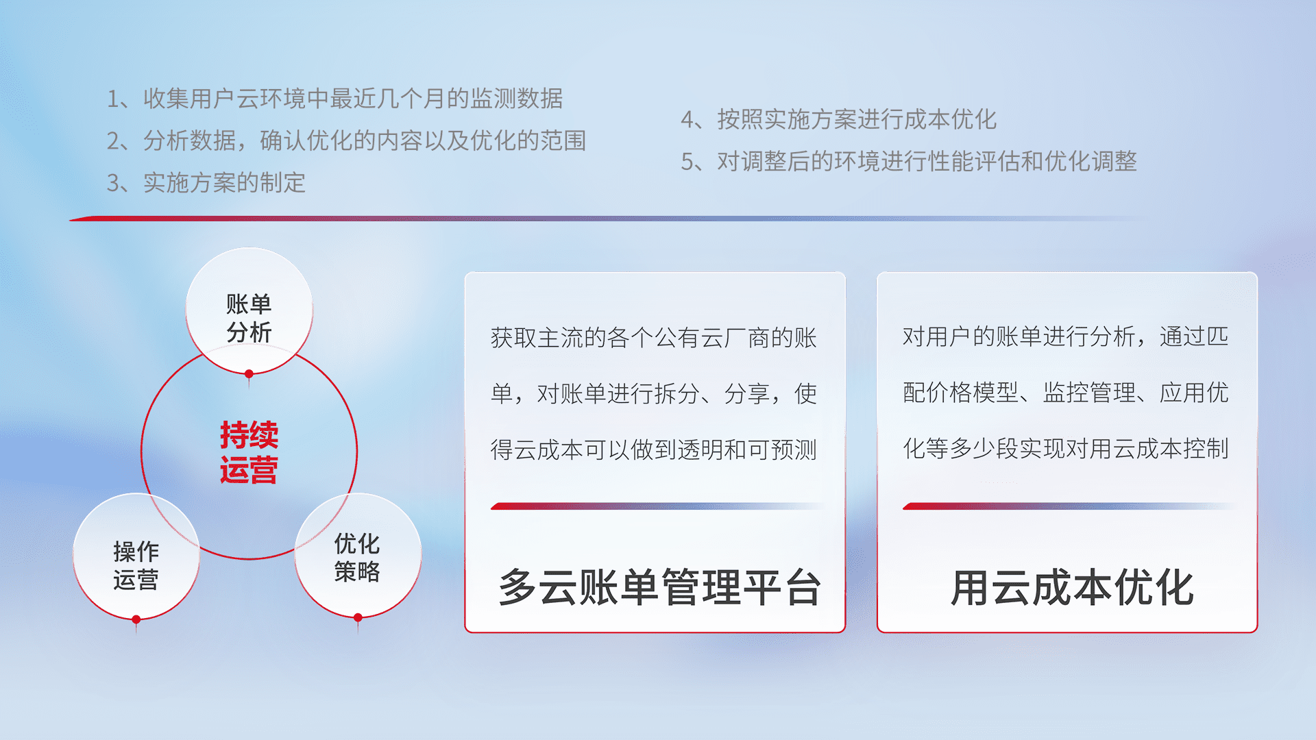 通过多云纳管,,,,以统一的资源数据模型把客户的云资源进行抽象和封装,,,进而实现对多云资源的统一操作,,,保障云资源管理的可靠性、、、、稳定性与可用性。。量身定制化运维内容,,,,配置、、、开发运维、、补丁管理、、备份、、、监控、、、、认证和访问管理、、审计和日常巡检等,,,保障在用云过程中的可靠度,,,稳定度以及高可用率。。